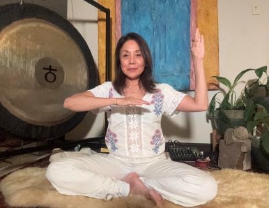 Sit with a straight spine with your right arm raised in front of your Heart Center, elbow bent, palm facing down. Extend your left arm to the side at shoulder level, elbow bent, fingers in Gyan Mudra. Keep your eyes softly focused at the tip of your nose and chant steadily on each breath: Har har har har Haree Haree.